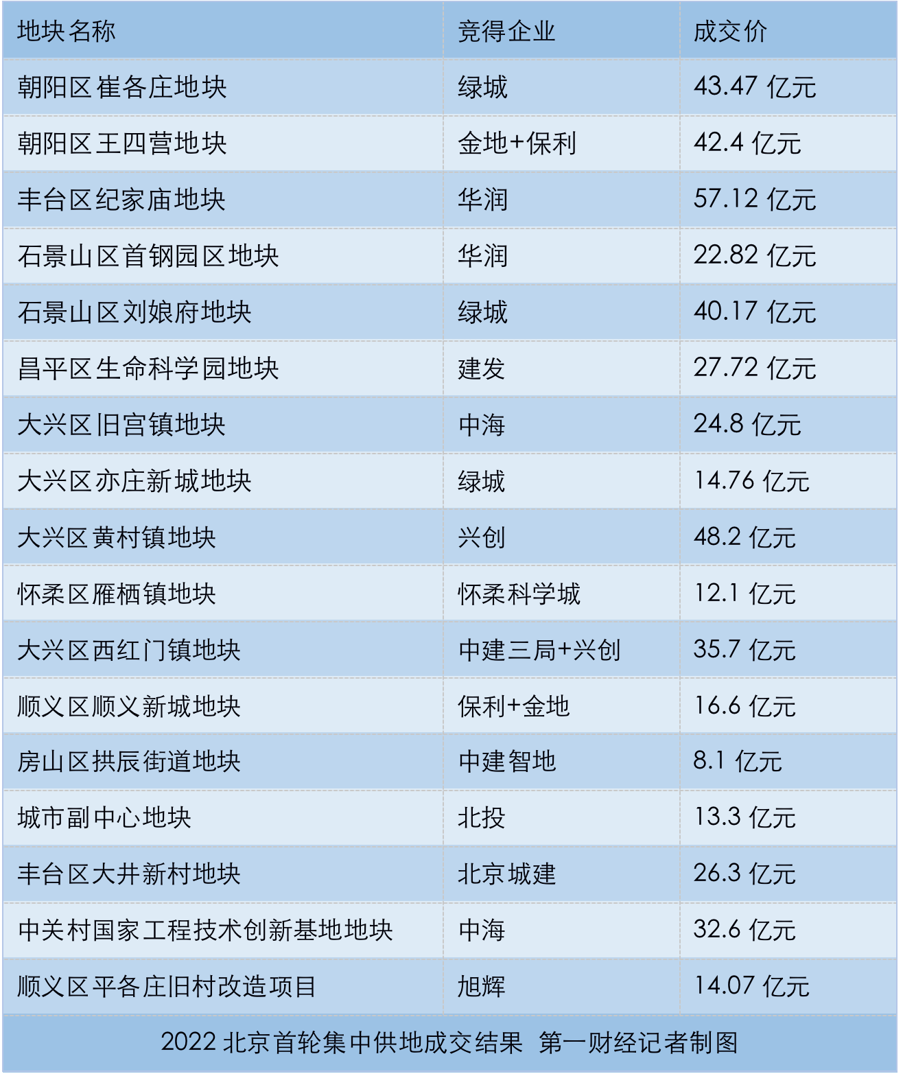 华润置地(01109.HK)、中海地产(00688.HK)、绿城中国(03900.HK)成为本次土拍的活跃选手,绿城接连拿下朝阳区、石景山区、亦庄新城共三宗地块,华润置地取得丰台区、石景山区两宗地块,中海地产同样包揽两宗地块。