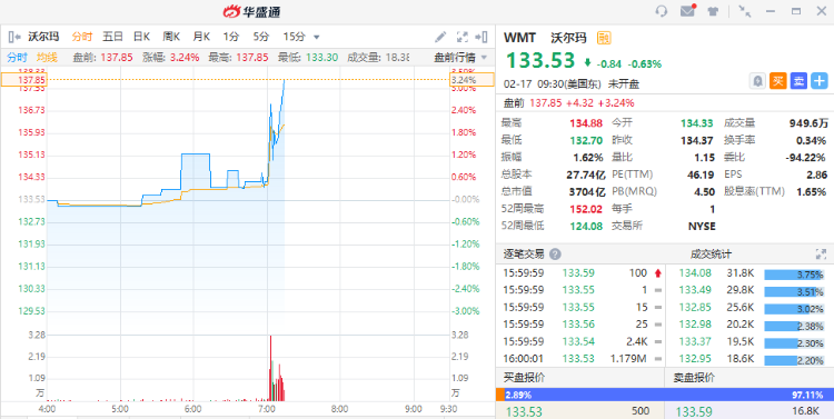 格隆汇2月17日丨沃尔玛第四季度营收1528.7亿美元,预估1516.7亿美元;调整后每股收益1.53美元,预估1.51美元。沃尔玛计划在2023财年回购至少100亿美元股份。财报发布后,该股走高涨超3%。