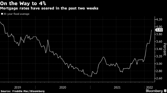 这是抵押贷款利率连续第二年攀升,追随10年期美国国债收益率涨势,10年期收益率上周自2019年7月以来首次突破2%。为遏制处于40年高位的通胀率,美联储考虑开始升息。