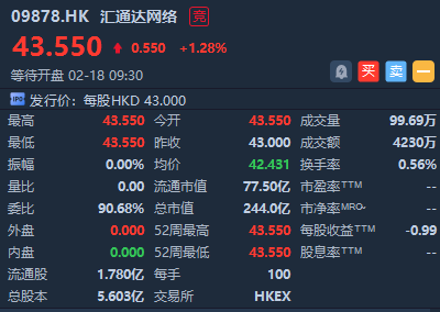 华盛资讯2月18日讯,下沉市场电商平台汇通达网络 $09878.HK 首挂高开1.28%,一手账面浮盈55港元,盘前成交额4230港元,最新总市值超244亿港元,昨日暗盘收涨4.88%。