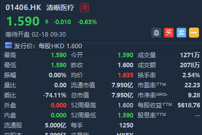 眼科医疗机构清晰医疗 $01406.HK 首挂低开0.63%,盘前成交额2078万港元,最新总市值近8亿港元,昨日暗盘平收。