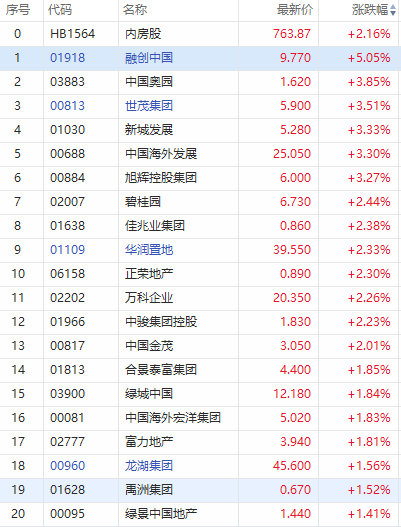华盛资讯2月18日消息,内房股集体反弹,融创中国涨超5%,中国奥园、世茂集团、新城发展、碧桂园等涨超3%。