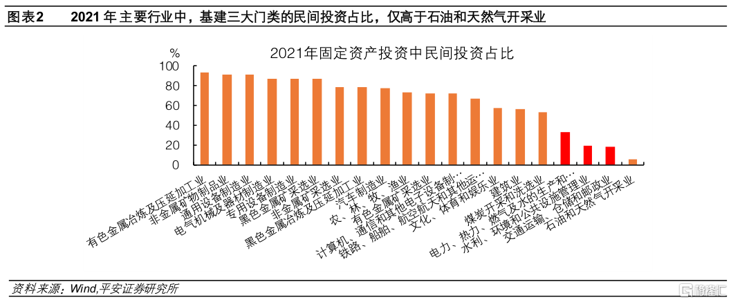 基建投资由政府主导,政府意愿是影响基建投资的重要因素。基建的三大门类,即电力、热力、燃气及水的生产和供应业,水利、环境和公共设施管理业,以及交通运输、仓储和邮政业,2021年固定资产投资中民间投资的占比分别为33.1%、19.7%和18.7%,在主要行业中仅高于石油和天然气开采这一垄断行业的民间投资占比5.3%。基建项目的民间投资占比低,主因是多数基建项目具有正外部性,所产生的社会效益难以完全体现在现金流回报上,公益性意味着需要政府来主导基建投资。