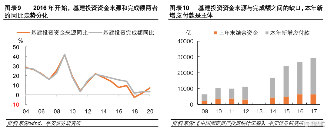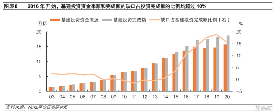 2015年之前,基建投资资金来源与完成额的缺口较小。2016年之后,两者缺口开始扩大。2017年到2019年,基建投资资金来源从14.95万亿下降到14.78万亿,而基建投资完成额从17.31万亿提高至18.21万亿。2019年两者缺口达到3.43万亿,占基建投资完成额的比例为18.8%。因资金缺口的存在,2015年后两者同比走势出现分化,因此通过估算基建投资资金来源及其同比,去推算基建投资完成额的同比容易产生误差。
