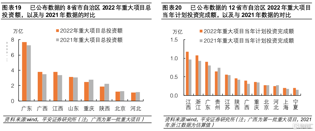 今年已公布重大项目全年投资计划的11个省市自治区,以及公布一季度投资完成计划的广西,合计计划在当年(季)投资6.51万亿。这12个省市自治区除浙江外,均公布了2021年(广西是2021年一季度)的当年计划投资额,为4.30万亿。浙江省公布了2019年、2020年和2022年的“4+1”重大项目在当年的计划投资完成额,2020年同比增长13.8%,2020年到2022年的复合增速为15.3%,假设2021年同比增长14.5%,估算得2021年浙江省“4+1”重大项目当年计划投资完成额为9292亿。据此,可算出2022年已公布当年(季)计划投资完成额的省市自治区,其合计同比增长9.1%。2021年全国有18个省市自治区公布了当年的重大项目计划投资完成额,合计为8.09万亿,同比增长13.1%,高于2022年已公布当年(季)计划投资完成额的同比。