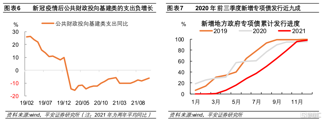 一般公共预算方面:2021年公共财政支出中与基建相关的四个分项均负增长,也是主要分项中仅有的四个负增长领域。这四个分项总支出同比下降6.0%,两年平均同比下降6.5%。考虑到这四个分项中还有民生性相关支出,与基建相关的子项支出同比跌幅大概率更大。2022年要实施组合式、规模性减税降费,规模预计将超过2021年的1.1万亿。与此同时,因出口和地产产业链增速放缓,保市场主体和社会保障性支出对一般公共财政支出的诉求上升。我们认为,2022年一般公共财政基建类支出的收缩速度可能比2021年更快,环比降幅或将超过3500亿(此为2020年数据,2021年的尚未公布,大概率超过2020年的环比降幅3500亿)。