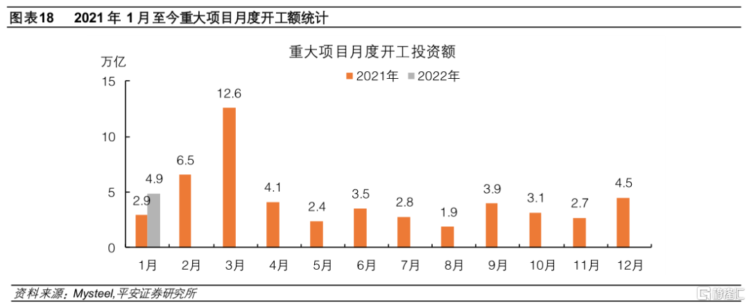 2022年重大项目的开工时间也早于往年。1月广西、河南、安徽、浙江、四川5省市自治区进行了全省集中开工活动,湖北各市县区密集开工。根据Mysteel的不完全统计,2022年1月全国20个省市自治区共开工6634个项目,总投资额4.9万亿,同比增长68%。