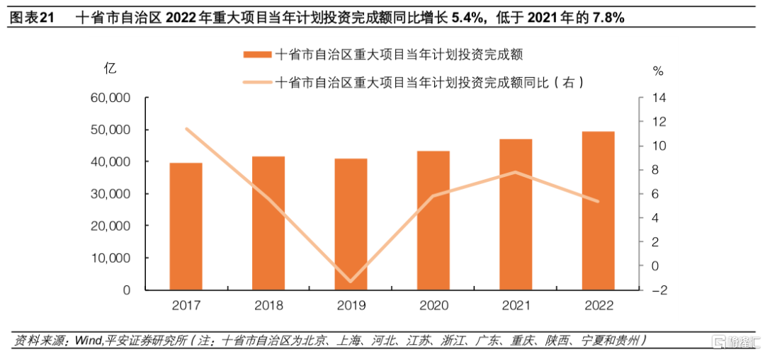 从可比口径看,目前已知北京、上海、河北、江苏、浙江、广东、重庆、陕西、宁夏、贵州这10个省市自治区,在2017年-2022年各年重大项目的当年计划投资完成额。2022年上述10个省市自治区重大项目当年计划投资完成额同比5.4%,低于2021年的同比7.8%。
