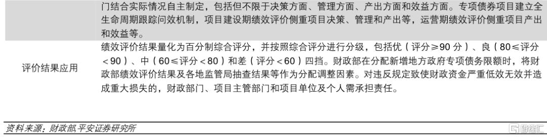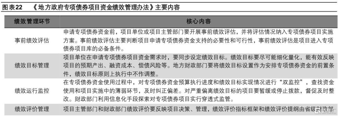 因此,近年加强了对专项债券项目资金绩效的全生命周期管理。2021年7月1日,财政部发布《地方政府专项债券项目资金绩效管理办法》(财预〔2021〕61号),坚持“举债必问效、无效必问责”,遵循项目支出绩效管理的基本要求,注重融资收益平衡与偿债风险。建立规范的工作流程和指标体系,推动绩效管理工作有序开展。与文件发布前专项债管理重点关注“怎么借”和推动资金加快使用相比,61号文通过事前绩效评估、绩效目标管理、绩效运行监控、绩效评价管理和绩效评价管理,在事前、事中和事后,对专项债券项目资金绩效实行全生命周期管理。