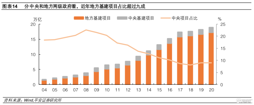 基建投资由政府主导,分中央和地方两级政府看,地方项目占比超过九成。2008年到2020年,中央基建项目占比整体一路走低,从22.6%下降至8.9%。由于地方政府是基建投资的绝对主体,推动地方加快项目储备并做好前期工作,是基建投资能够尽早形成实物工作量的必备前提。