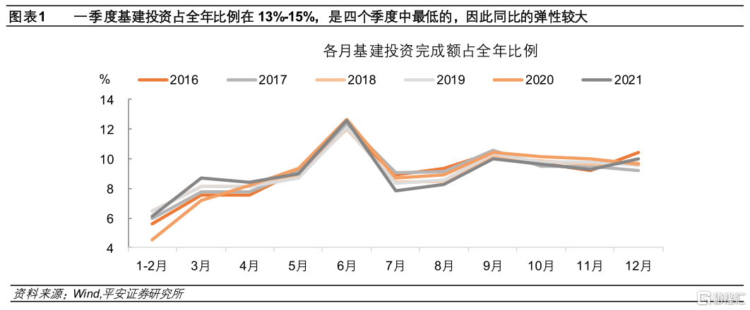 1、在中国经济面临放缓压力的当下,政府稳增长诉求和意愿均在上升。考虑到重大项目集中开工时间早于往年、2021年四季度新发行的1.2万亿新增专项债留待使用,加之一季度基建投资占全年比例在13%-15%,同比增速弹性较高,因此可以对2022年一季度的基建投资增速高看一眼。