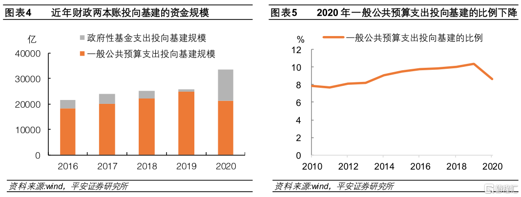 最后,将每年基建投资来源于国家预算资金的规模,减去一般公共预算投向基建的规模,得到政府性基金投向基建的规模。