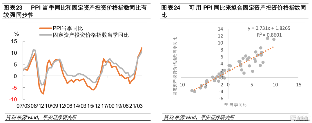 价格因素对基建名义同比的贡献比2021年低3.2个百分点。利用PPI同比和固定资产投资价格指数同比的相关性,估算得2021年和2022年固投价格指数同比分别为7.8%、4.6%,PPI同比回落将拖累基建同比读数。