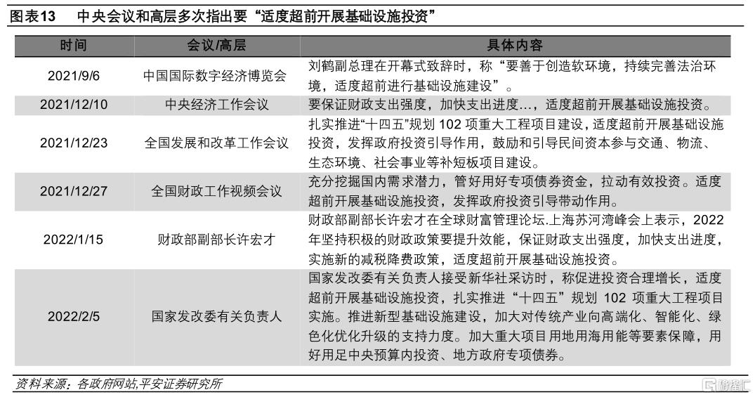 2021年7月政治局会议指出“合理把握预算内投资和地方政府债券发行进度,推动今年(2021)底明年(2022)初形成实物工作量”后,中央会议和高层多次提及要“适度超前开展基础设施投资”。