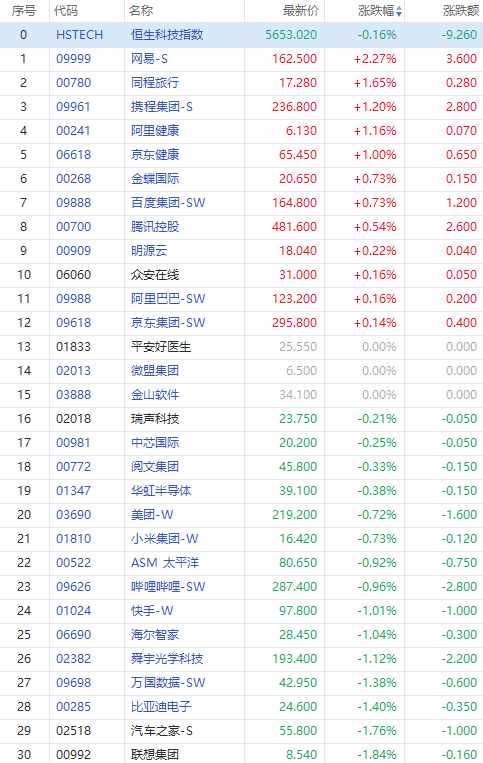 其他成分股,网易逆市上涨逾2%,同程、携程等涨超1%,腾讯、阿里等微涨。