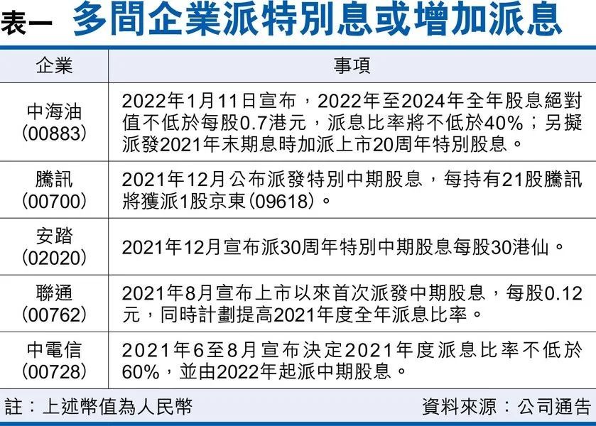 申万宏源香港发布研究报告称,腾讯控股(00700)、安踏体育(02020)、中海油(00883)派发特别股息后,网龙(00777)也宣布派特别中期股息每股1.43港元,将于2月17日除净,股息率有7厘。该行认为,航运股和石油股皆有机会派发特别股息。航运股当中,东方海外(00316)、太平洋航运(02343)、海丰国际(01308)、中远海控(01919)皆有机会派发特别股息。至于石油股,发布盈喜的中石油(00857)最有机会派发特别息。