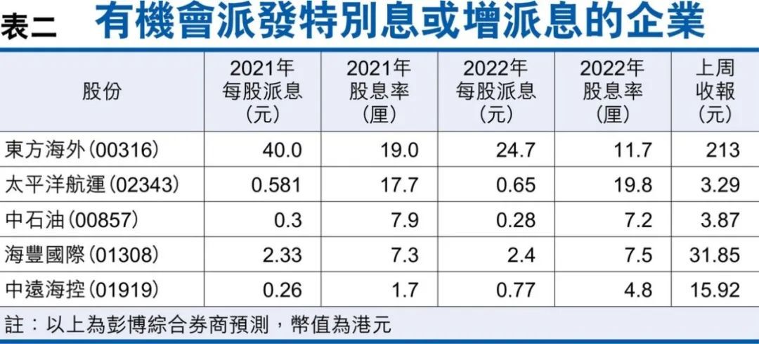2)航运股当中,东方海外(00316)、太平洋航运(02343)、海丰国际(01308)、中远海控(01919)皆有机会派发特别股息。至于石油股,发布盈喜的中石油(00857)最有机会派发特别息。