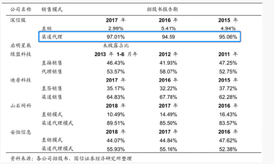 据深信服招股书披露信息,深信服的销售模式大部分以渠道代理商为主,渠道代理销售是指先将产品销售给渠道代理商,再由渠道代理商将产品销售给终端用户,其渠道代理商占比超过95%。而同行渠道商代理占比并没有深信服占比高,具体如下数据: