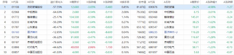 洛阳玻璃股份A股跌4.98%,H股跌3.65%,中铝国际A股跌3.61%,H股跌3.94%,赣锋锂业A股跌2.17%,H股跌0.59%。