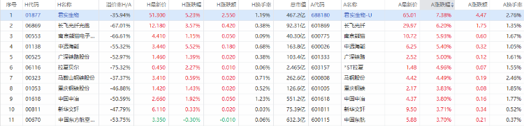 以A股收盘时间,AH股涨幅前10如下: