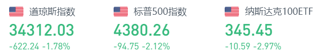截至2月17日周四收盘,道指跌622.24点,跌幅为1.78%,报34312.03点;纳指跌407.38点,跌幅为2.88%,报13716.72点;标普500指数跌94.75点,跌幅为2.12%,报4380.26点。