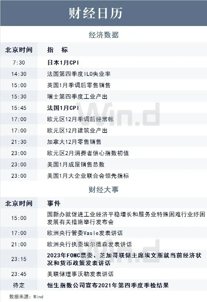 当地时间周四(2月17日),美联储鹰派官员、圣路易斯联储主席布拉德在哥伦比亚大学的一次小组讨论中表示,要打压通胀可能需要美联储将基准利率调整至中性目标利率(他认为在2%左右)上方。值得关注的是,今晚将有多位美联储官员讲话。