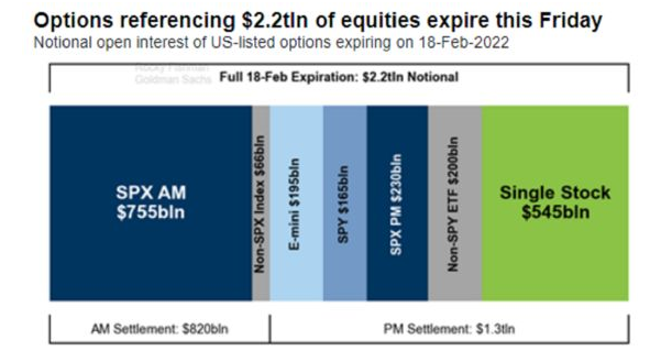 从地缘政治到美联储鹰派立场等各种因素都在打击投资者的神经,股市投资者正准备迎接本周混乱的结束,周五将有2.2万亿美元的期权到期。高盛策略师Rocky Fishman表示,约9850亿美元的标普500挂钩合约和1650亿美元与全球最大的交易所交易基金SPDR标普500指数ETF相关的期权将到期。