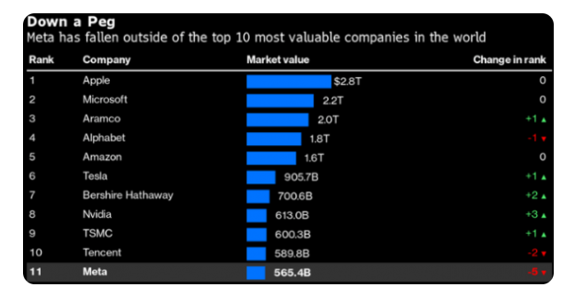 8、元宇宙拉Meta下神坛?Meta市值跌出全球前十