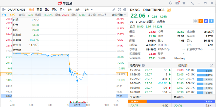 DraftKings $DKNG 盘前直线下挫一度跌超18%,Q4净亏损同比扩大