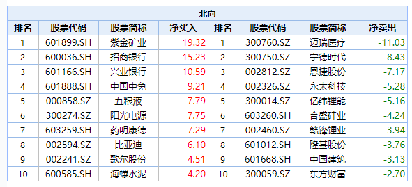 本周北上资金买入金额最多的标的为紫金矿业,一周净买入19.32亿元,招商银行获净买入15.23亿元,兴业银行获净买入10.59亿元;此外,中国中免、五粮液、比亚迪等获得买入。