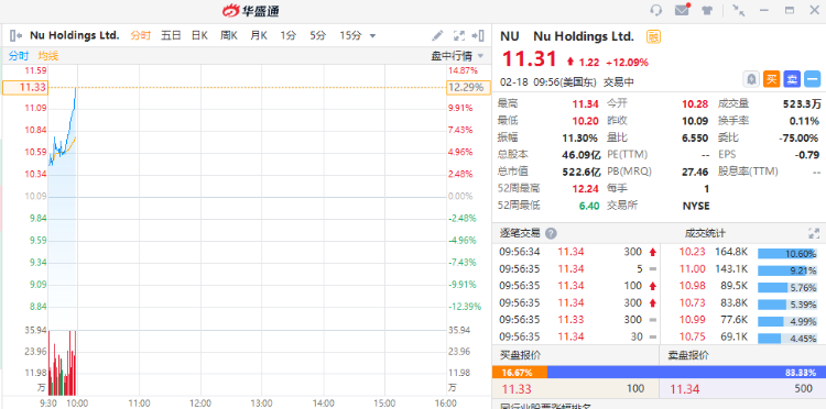 华盛资讯2月18日消息,美股早盘,Nu Holdings直线拉涨,截至发稿,该股涨超12%,股价报11.31美元。