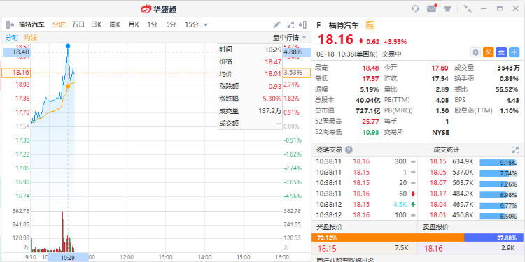 市场消息:福特汽车(F)考虑分拆电动车或燃气发动机业务部门。该股盘中短线拉升,一度涨超5%。