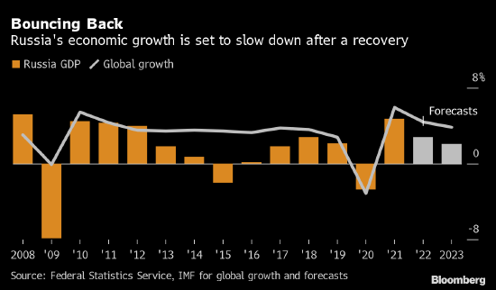 随着油价上涨和消费支出增加,全球最大能源出口国俄罗斯2021年的经济增速达到了10年多来的最高水平,从前一年疫情导致的衰退中反弹。