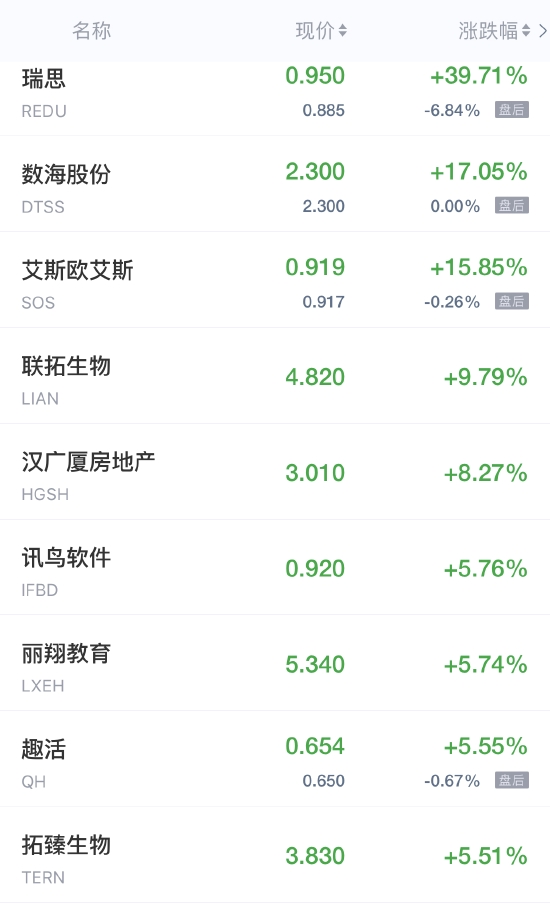 瑞思暴涨超39%,趣活、丽翔教育涨超5%,前程无忧涨近2%,陆金所涨超1%。