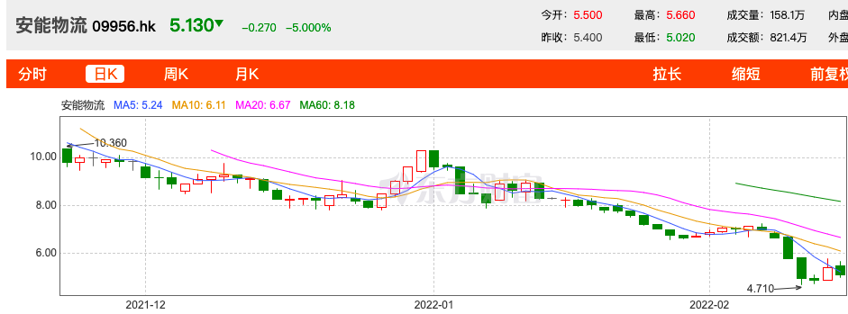 自去年正式登陆港交所以来,一定程度受大环境影响,安能物流股价连续下滑。上市当日,安能股票发行价为13.88港元/股,市值约161.4亿港元。而在2月14日、2月15日,安能股价连续两天跌幅超过10%。以昨日(2月18日)收盘价5.13港元来看,安能物流市值较上市当日已缩水超过100亿港元。