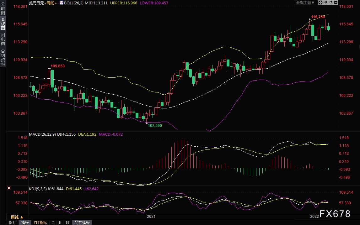 本周日元震荡上涨,主要是受到俄罗斯和乌克兰紧张局势推升的避险情绪支撑;美元兑日元最低触及114.97.逼近近两周低位,收报115.01,美元兑日元周线跌幅约0.36%,