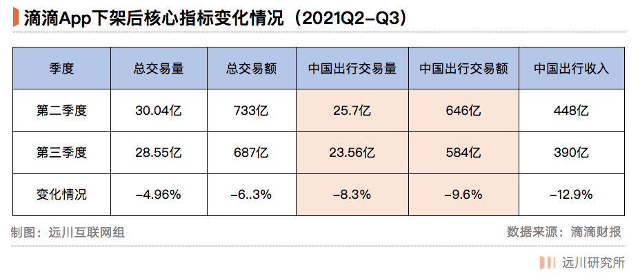短期内,滴滴的确被抢走了部分生意,但并不致命。如下图所示,2021年Q3季度,滴滴总单量环比下降近5%,其中中国出行交易量下滑8.3%,相应的中国出行交易额下滑了9.6%。