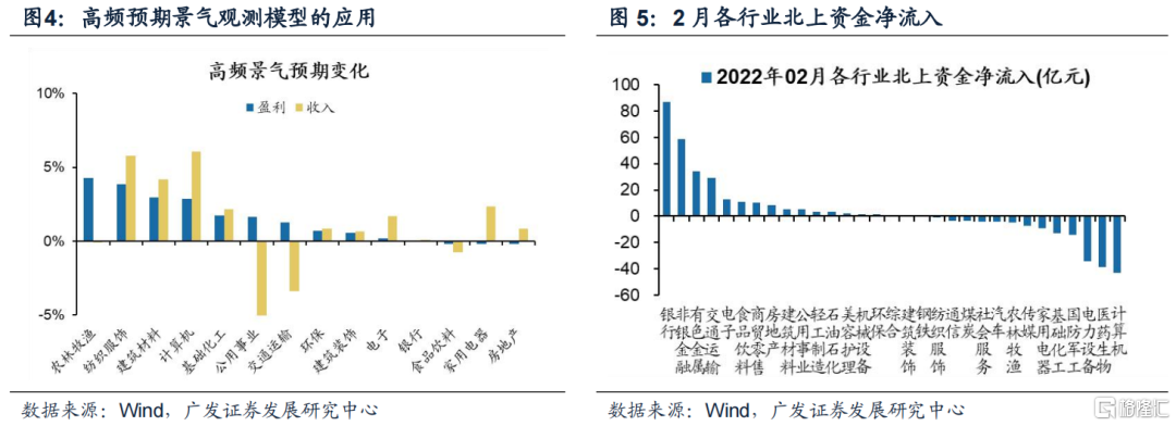 方法2:“广发策略·高频预期景气观测框架”。我们发现,诸多行业的超额收益与行业的高频预期景气边际变化方向显著相关,因此我们自21.8.29《中报季如何布局市值下沉?》起持续应用“高频预期景气观测框架”进行行业比较。我们观察各个行业2月18日相对1月末的景气预期边际变化,寻找当前景气预期改善最为明显的行业。截止2月18日收盘,一级行业中农林牧渔、纺织服饰、建筑材料、计算机、基础化工的盈利景气预期边际改善最为显著,计算机、纺织服饰、建筑材料、家用电器、基础化工的收入景气预期边际改善最为显著。