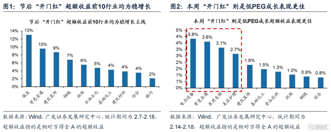 (一)本周A股延续虎年“开门红”,我们春节后提示“两大预期差”边际改善和绝对收益产品“负反馈”基本结束支撑了A股“开门红”延续。我们在2.6《A股开门红如何布局?》中判断3大因素的变化将支撑A股开门红:(1)短期市场对于美联储的加息预期已经较为充分price-in;(2)春节后到两会期间,“稳增长”政策会密集落地;(3)我们判断绝对收益产品减仓的“负反馈”基本结束。在建议积极布局A股节后开门红行情的同时,我们也提示了结构上的机会“高区-低区均衡配置”:除了我们前期提示并获得显著超额收益的地产/基建链以外,还可以重点关注低PEG的科技股以及“稳增长”和“双碳”交集的价值股(国企传统产能“低碳转型”再加杠杆)。春节后,万得全A上涨2.95%,实现“开门红”,获得超额收益前10的行业大多为我们提示的稳增长主线;而本周万得全A涨幅1.70%,其中偏成长类行业则领衔本周超额收益。