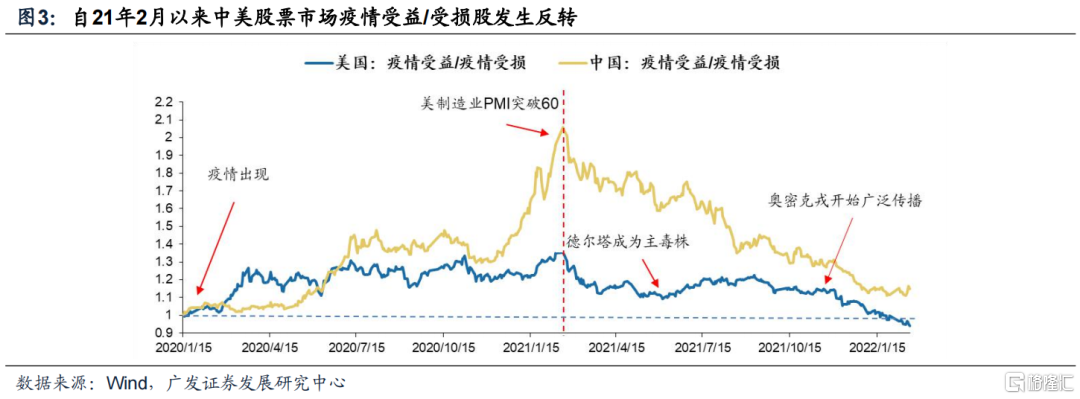 自从21年2月美国制造业PMI在疫后首次突破60以来,中美股票市场疫情受损股的表现开始持续优于疫情受益股。虽然21年6月由于德尔塔毒株成为主要传播毒株后,中美股票市场分别经历了1-3个月不等长度的疫情受益股短暂占优阶段;但随着疫苗的普及率提升、全球开放步伐的加快,中美股票市场的疫后复苏逻辑重新占优并持续至今。同时我们发现,21年11月开始的奥密克戎毒株的广泛传播并没有改变全球开放的步伐——奥密克戎毒株虽然相对德尔塔毒株具有更强的感染性,但其重症率和死亡率明显更低。我们如果假定未来没有新的变异毒株改变特性,国内政策大的方向仍是逐步放开,在此逻辑下中国股票市场“疫后复苏”的逻辑仍将继续演绎。