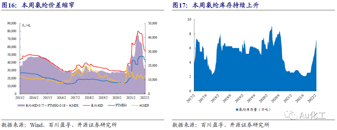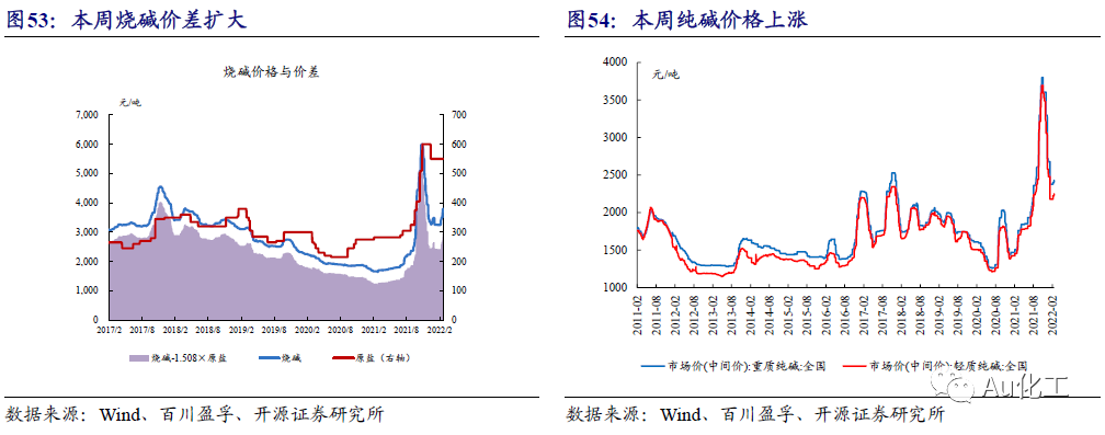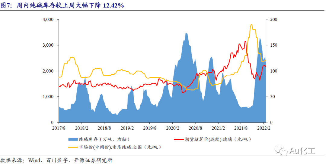 需求方面,本周浮法玻璃库存大幅下降,光伏玻璃新增一条产线。浮法玻璃方面,根据卓创资讯数据,本周国内浮法玻璃均价为2,399元/吨,较上周上涨10.51%。本周国内浮法玻璃成交良好,以备货性需求为主。本周下游玻璃加工厂陆续开工,浮法玻璃厂家库存继续削减。短期,多数浮法玻璃厂家库存偏低,浮法玻璃价格仍有望上涨。截至2月17日,全国浮法玻璃生产线共计304条,在产263 条,日熔量共计 174,375 吨,较上周持平。周内暂无产线变化。根据百川盈孚数据,截至2月18日,平板玻璃库存为139.65万吨,较上涨大幅下降20.19%。光伏玻璃方面,目前组件厂家开工情况稳定,玻璃库存量不大,而成品库存近日有所增加,备货节奏稍有放缓。受成本增加影响,光伏玻璃厂家推涨积极性较高。截至2月17日,2.0mm镀膜面板主流大单价格 19.2 元/平方米,较上周持平;3.2mm 原片主流订单价格16.5-17.0元/平方米,较上周持平,同比跌幅49.24%;3.2mm镀膜主流大单报价25元/平方米,较上周持平,同比跌幅40.48%。浙江嘉兴福莱特玻璃有限公司1,000t/d一窑四线新产线于2022年2月16日点火。截至2月17日,全国光伏玻璃在产生产线共计234条,日熔量合计42,210吨,较上周增加2.43%,同比增加28.38%。我们认为,当前随着硅料价格下降,光伏产业链成本压力已大大缓解,2022年光伏装机有望超预期,带动纯碱需求大幅增长。