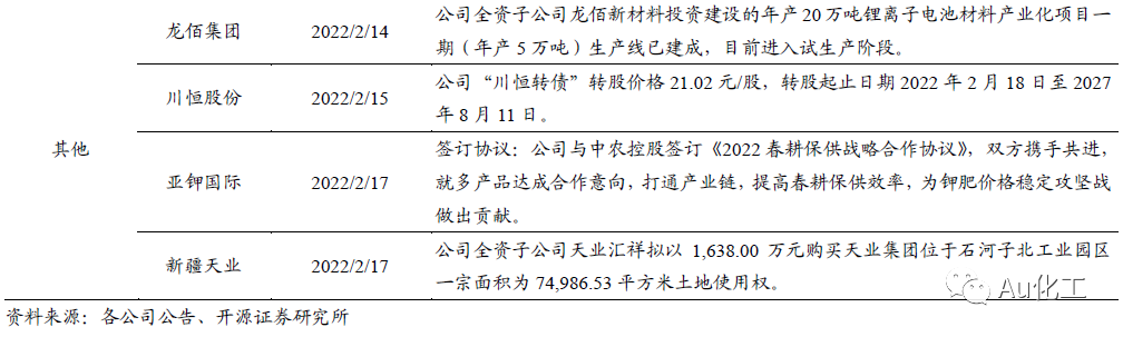 库存方面,据百川盈孚数据,截至2月18日,纯碱企业库存总量为112.90万吨,较上周大幅下降12.42%。随着下游房地产竣工和光伏产业链复苏,我们看好纯碱现货价格止跌回升,2022年纯碱价格维持高位。受益标的:远兴能源、中盐化工、山东海化、三友化工、云图控股、和邦生物等。
