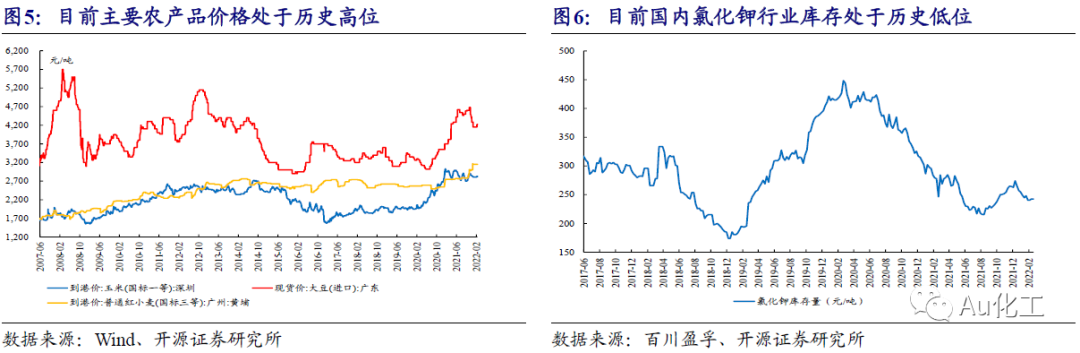 根据中国化肥信息报道,2022年2月15日,中方钾肥进口谈判小组(中化、中农、中海化学)与加拿大钾肥公司就2022年度钾肥进口合同达成一致,合同有效期到2022年12月31日,合同价格为590美元/吨CFR(按照当前汇率,折合人民币3,732元/吨),价格同比上涨138.9%,创历史新高,但是此价格仍处于世界钾肥价格洼地。随着全球农化持续景气,而钾肥产能在过去几年扩产较少,导致全球2022年钾肥价格大幅攀升。根据百川盈孚数据,截至2月18日,国内氯化钾价格为3,475元/吨,行业库存为24.25万吨,处于历史低位。随着钾肥进口合同价格创历史新高,农化产品价格处于历史高位,钾肥景气有望继续上行。受益标的:盐湖股份、东方铁塔。