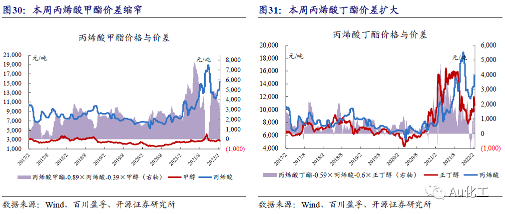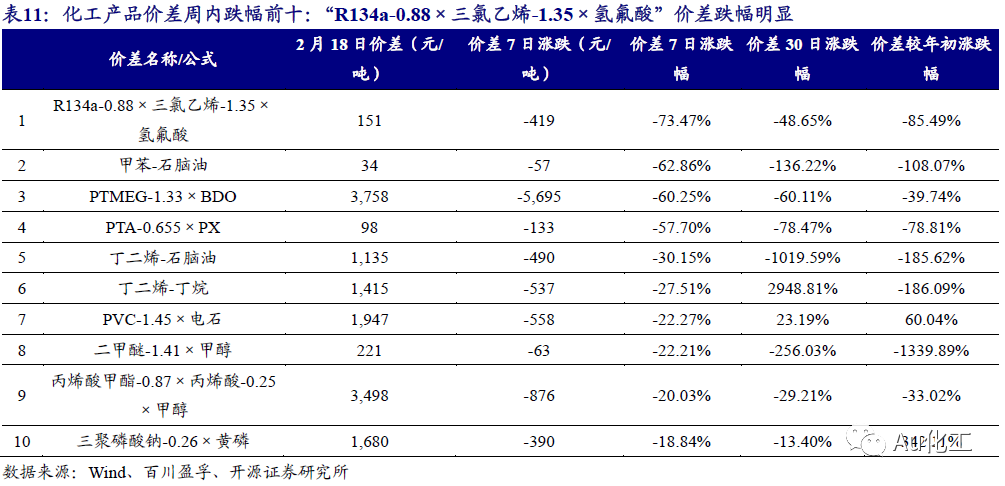 近7日我们跟踪的72种产品价差中,“丙烯酸丁酯-0.59×丙烯酸-0.6×正丁醇” 价差显著扩大;“R134a-0.88×三氯乙烯-1.35×氢氟酸”价差跌幅明显。