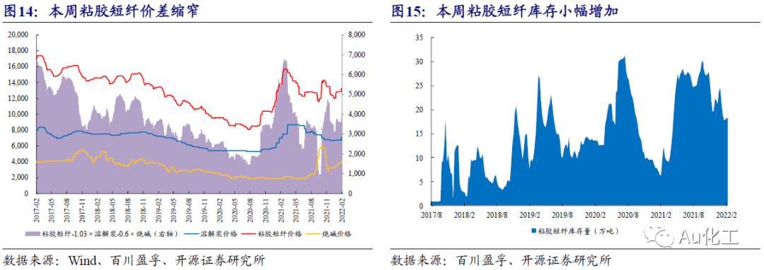 粘胶短纤:本周(2月14日-2月18日)粘胶短纤市场持稳运行。根据百川盈孚数据,本周国内粘胶短纤周均价为13,000元/吨承兑,较上周均价有所上涨。目前粘胶短纤市场仍处于恢复状态,但液碱、溶解浆价格上涨,粘胶短纤成本有所提升。供应端,本周粘胶行业装置检修,整体开工由上周的82.44%下落至80.65%。需求端,下游纱厂逐步开工,本周人棉纱市场平稳整理。库存方面,厂家库存小幅增长,但厂家库存压力依旧较低,截至2月17日,粘胶短纤库存为18.46万吨,较上周上涨0.82%。受益标的:三友化工。