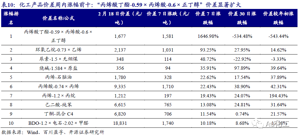 4.2、 本周价差涨跌排行:“丙烯酸丁酯 -0.59×丙烯酸-0.6×正丁醇” 价差显著扩大;“R134a-0.88×三氯乙烯-1.35×氢氟酸”价差跌幅明显