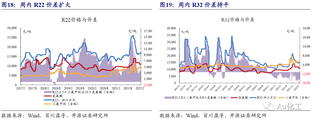 成本端,萤石价格弱势维稳,含氯原料价格开启上涨。(1)萤石、氢氟酸方面,本周(2月14日-2月18日)萤石市场价格弱势维稳。根据百川盈孚数据,截至2月18日,97%萤石湿粉市场主流价格在2,600-2,800元/吨供应方面,北方萤石厂商复工节奏缓慢,南方厂商部分开工,但整体开工率仍处低位。无水氟化氢市场弱势延续,无水氟化氢目前华东市场价格在10,500-11,500元/吨,北方片区市场价格在10,000-11,000元/吨。(2)三氯乙烯方面,本周(2月14日-2月18日)三氯乙烯市场价格上涨。华东地区三氯乙烯散单散水送到报价10,800-11,000元/吨;西南、西北地区三氯乙烯散单散水送到报价9,800-10,000元/吨左右,部分厂家暂不报价。(3)四氯乙烯方面,本周(2月14日-2月18日)四氯乙烯市场价格继续上涨。山东地区四氯乙烯企业散水出厂价格在9,500/吨左右;江浙地区四氯乙烯企业散水出厂价格在9,000元/吨左右;西北、西南地区四氯乙烯价格在9,900元/吨左右。(4)二氯甲烷方面,本周(2月14日-2月18日)国内二氯甲烷价格维持高位。根据百川盈孚数据,二氯甲烷山东市场均价5,499元/吨,较上周均价上涨446.4元/吨,江浙一带二氯甲烷均价5,429.2元/吨,较上周均价下跌312.2元/吨,华南一带5,320元/吨,较上周下跌80元/吨。(5)三氯甲烷方面,本周(2月14日-2月18日)国内三氯甲烷市场高价维稳。根据百川盈孚数据,本周山东地区氯仿市场均价5,079.8元/吨,较上周均价比上涨360.8元/吨,江浙一带氯仿均价5,360元/吨,较上周上涨202.86元/吨。