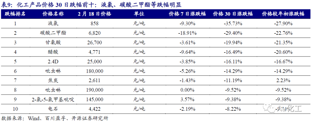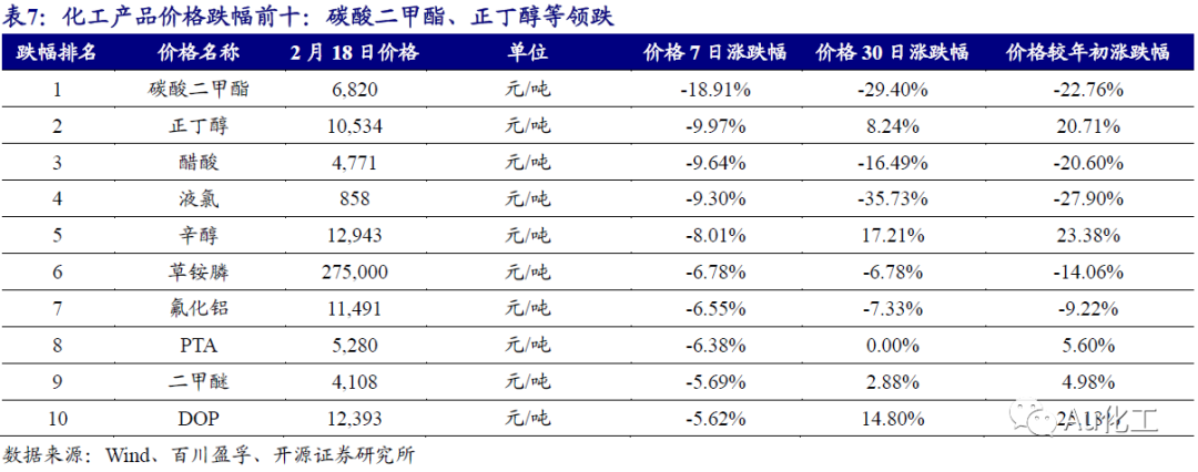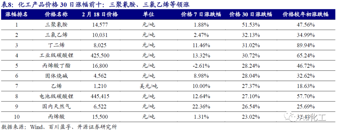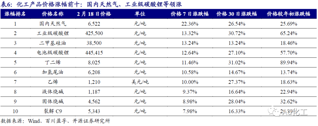 3.1、 本周化工品价格涨跌排行:国内天然气、工业级碳酸锂等领涨