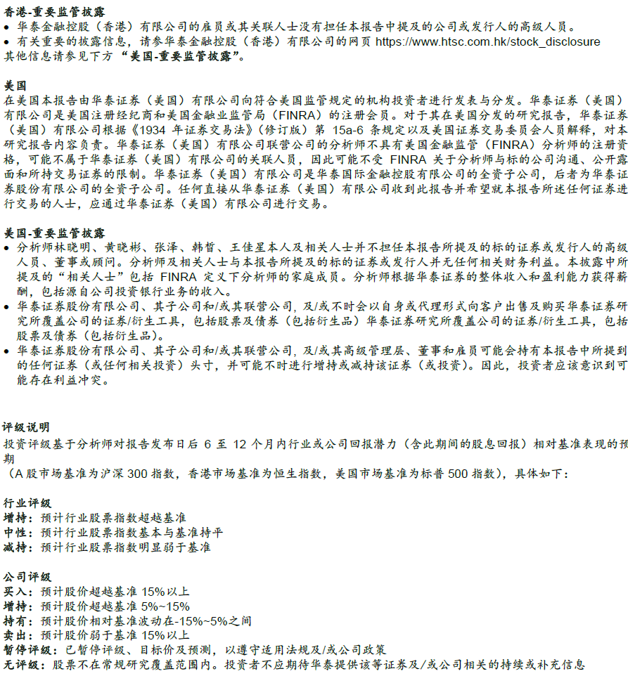 在任何情况下,本公众号中的信息或所表述的意见均不构成对客户私人投资建议。订阅人不应单独依靠本订阅号中的信息而取代自身独立的判断,应自主做出投资决策并自行承担投资风险。普通投资者若使用本资料,有可能会因缺乏解读服务而对内容产生理解上的歧义,进而造成投资损失。对依据或者使用本公众号内容所造成的一切后果,华泰证券及作者均不承担任何法律责任。