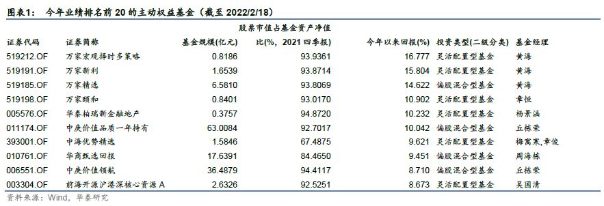 首先筛选出Wind数据库中股票型、偏股混合型、灵活配置型基金里在2021年四季报权益资产配置比例高于50%的基金,并剔除各类指数型基金,将其作为主动权益基金。统计今年以来截至2022年2月18日的复权单位净值增长率,并对该业绩回报进行从高到低排序,在区分基金份额的情况下,今年以来仅有约200只基金获得了正收益,约40%的基金回撤超过10%。以下展示了回报排名前10的基金: